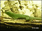 Anolis garmani: Die deutsche Bezeichnung ist Jamaica-Anolis. Es ist eine große, kräftige Art. Der recht massige Kopf setzt sich nur wenig vom Körper ab. Rücken und Schwanz zeigen, insbesondere bei den Männchen, einen ausgeprägten Schuppenkamm auf. Die Grundfärbung der Tiere ist auf der Oberseite ein schönes Smaragdgrün. Die Unterseite der Tiere ist wesentlich heller, fast weiss. Auf den Flanken können mehrere dunkle Querstreifen zu sehen sein. Nachts und in Ruhephasen soll sich laut Literaturhinweisen die Färbung in ein Braun wandeln. Das kann ich allerdings nicht bestätigen. Meine Tiere behalten nachts ihre grüne Färbung. Braun bis schwarz werden sie nur in Stresssituationen.